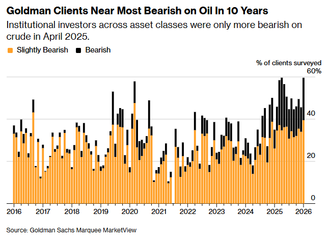 高盛集团的一项调查发现,在全球原油供应过剩迹象日益明显之际,地缘政治因素正推动机构投资者对原油的看空程度接近过去十年来的最极端水平。高盛周四发布的调查结果显示,在接受调查的逾1000名、横跨多种资产类别的客户中,超过59%的受访者对原油持看空或略微看空立场。这一情绪水平几乎触及可追溯至2016年1月的该月度数据集中的历史低点。唯一一次投资者对原油的悲观程度略高于当前是在去年四月,当时美国总统特朗普威胁对美国贸易伙伴大规模征收高额关税。此外,调查还显示,机构投资者中表示原油是其最偏好做空品种的比例创下历史新高。这进一步加剧了整体看空情绪。