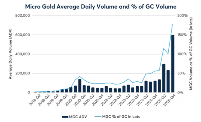 考虑到黄金衍生品的交易门槛过高,投资者可以关注并配置芝商所的微型黄金期货,该合约专为对较小黄金增量感兴趣的交易者而设计的,还可作为基准黄金期货合约的补充。微型黄金期货规模仅为基准黄金期货合约的 1/10,提供交易透明度、价格发现和较小的保证金要求。2025年,微型黄金期货日均交易量 (ADV) 达到 475,825 份合约(看图2),创下历史第二高的月度记录。