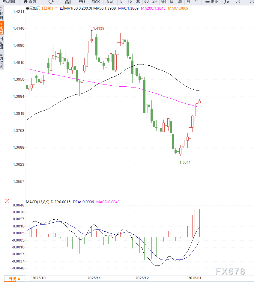若美元兑加元稳步突破1.3888阻力并站稳,可能打开进一步上行空间;下方支撑位于1.3820–1.3800区域,一旦失守,短线回调风险将上升。