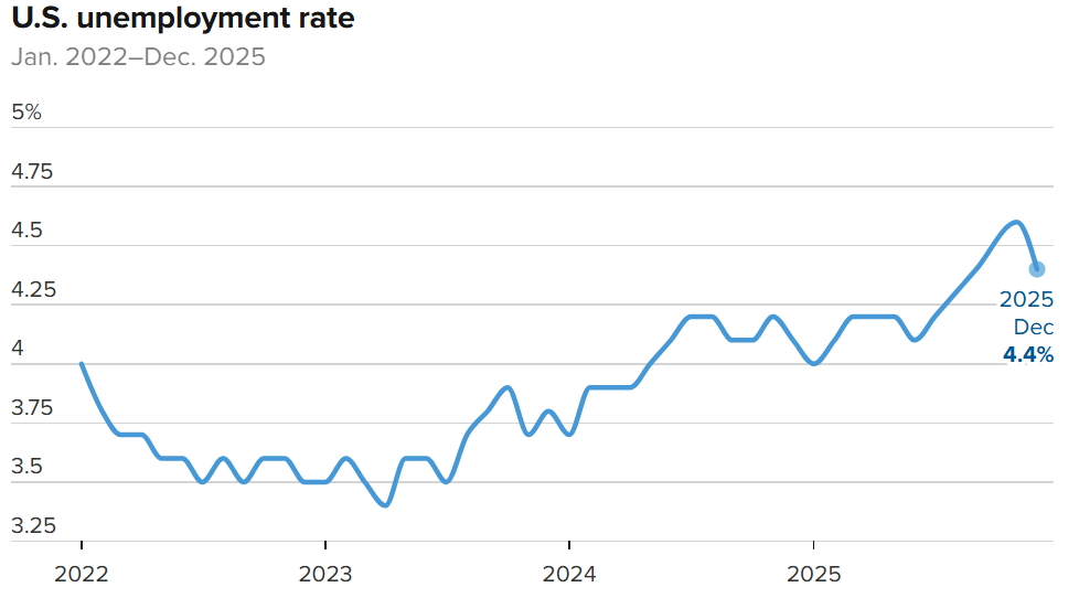 1月9日晚间,美国劳工统计局(BLS)公布的数据显示,去年12月非农就业人数增加5万人;此前两个月的数据被下修。失业率小幅降至4.4%,在创纪录的政府长期停摆结束后回落趋稳。