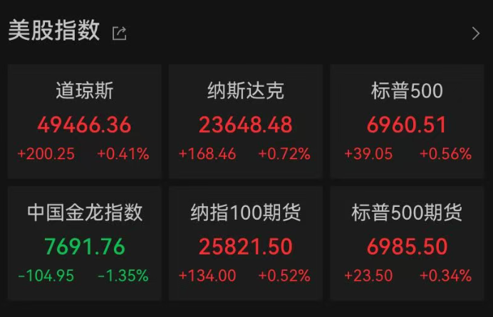 1月9日晚,美股三大指数集体高开。截至北京时间10日凌晨0:15,道琼斯指数涨0.41%,标普500指数涨0.56%,纳斯达克综合指数涨0.72%。