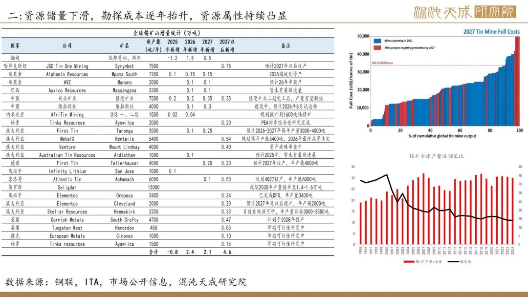 2022年锡矿90%分位完全成本位25581美元/吨,存量国家锡矿品味下降叠加能源成本抬升,全球锡矿成本中枢不断上移,据ITA,2027年全球锡矿完全成本90%分位线将上升至3.38万美元/吨。