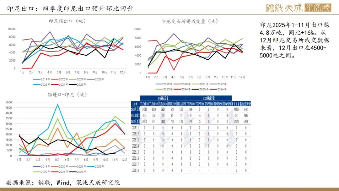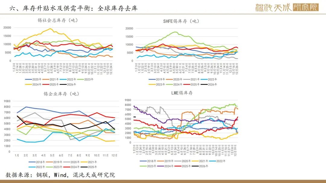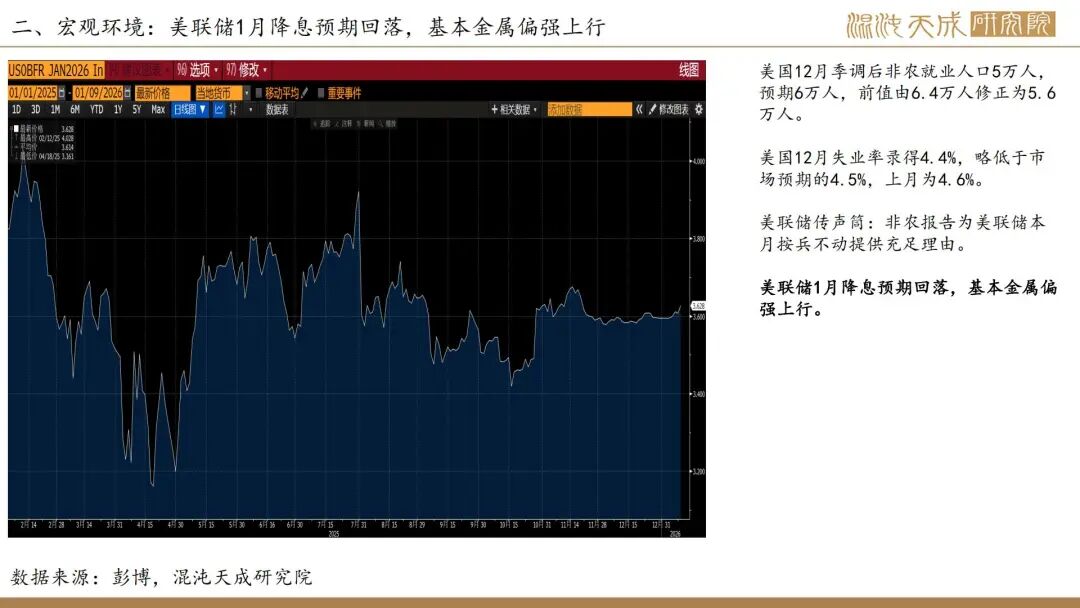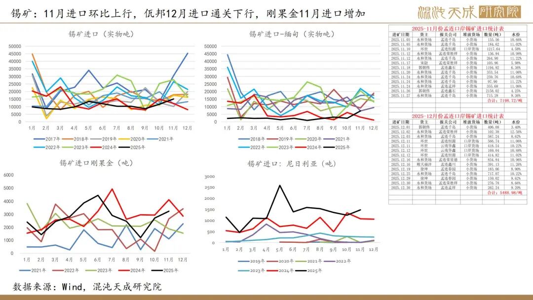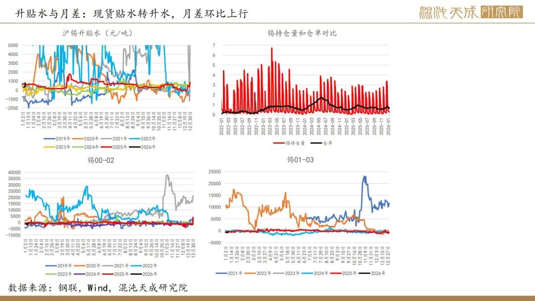美联储1月降息预期虽有所回落,但仍处降息周期下,且货币政策空间大,国内有望跟随降息,宏观环境整体偏多。刚果金当地紧张局势在和平协议签订后仍未缓解,据调研当地锡矿生产和运输暂未受到影响,但矿端供应的担忧因当地战乱的不确定性将持续存在。印尼出口配额申请中,短期出口骤减,同时因炸弹审批延缓,佤邦复产不及预期,锡矿供应短期仍偏紧。国内现货维持升水,全球库存开始去库,全球降息背景+矿端供应扰动难以消弭下仍可逢低多配。