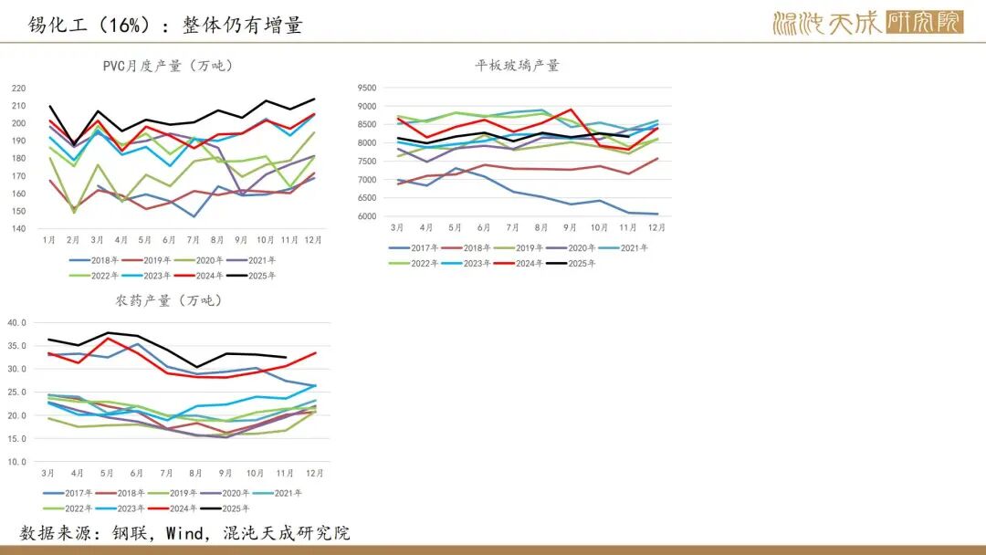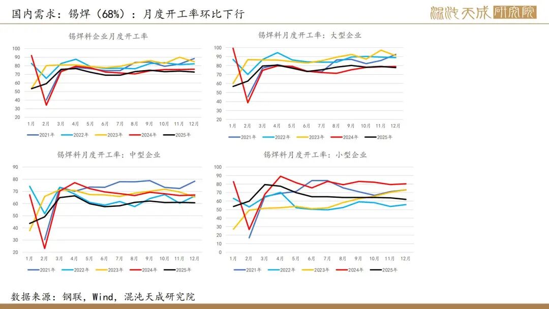 原料端国内锡矿1-10月产量6.18万吨,同比+0.7%,1-11月锡矿进口11.8万实物吨,同比-21.7%,其中11月进口锡矿15099实物吨,环比大幅增加,主要系佤邦复产增加。刚果金当地紧张局势在和平协议签订后仍未缓解,据钢联和SMM,阿尔法明锡矿生产和运输暂未受到影响,但矿端供应的担忧因当地战乱的不确定性将持续存在。印尼出口配额申请中,短期出口骤减。因炸弹审批延缓,佤邦复产不及预期,国内TC低位持平,锡矿供应短期仍偏紧。国内精锡2025年1-12月产量17.9万吨,同比-2.8%,周度开工率环比下行,现货升水回落。