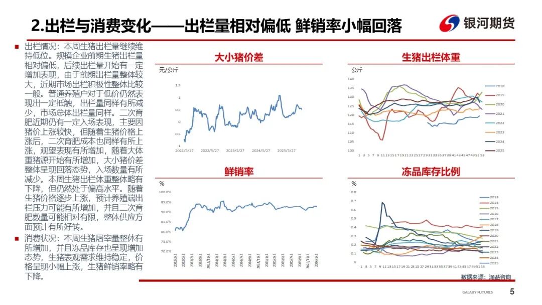 4月以来,猪价因多重非客观因素影响被明显推高,这与生猪及猪肉的客观供需结构呈背离状态。当下,生猪现货市场,北方价格小幅下滑,集团出栏量一般,散户存观望情绪,但屠企目前仍有压价意向,白条走货困难;南方价格稳中伴跌,养殖场均按计划出栏,实际成交量少,华南区域暴雨天气导致下游消费疲软,西南市场终端提振无明显支撑。