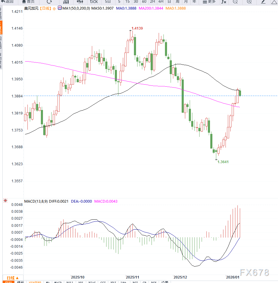 从日线结构来看,美元兑加元此前强势上行并一度站上200日均线,目前的回落更偏向技术性修正。1.3920附近构成阶段性阻力,而下方1.3800区域则是短期重要支撑位。