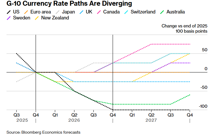 Bloomberg Economics预测数据显示,在未来一年内,拥有全球最大规模交易量的主权货币的央行们将出现多种不同的利率路径,而美国政策的不确定性及来自华盛顿的剧烈波动压力将持续考验央行决策者们的货币政策信心。