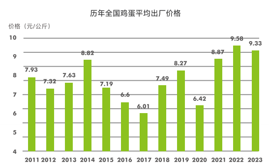 全国监测数据显示,2023年全国鸡蛋平均出厂价格为9.33元/公斤,比2022年的958元/公斤低0.25元,比2021年的8.87元/公斤高 0.46 元