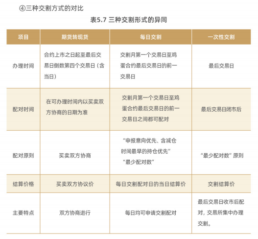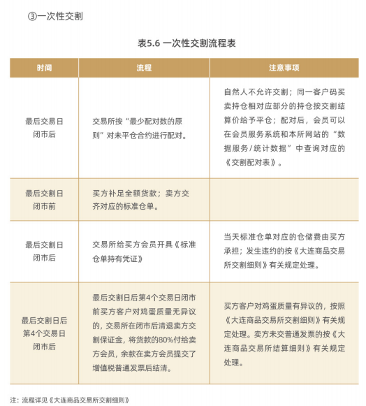 鸡蛋交割包括非标准仓单期货转现货交割(以下简称期转现)、每日交割和进入交割月后的一次性交割三种方式。