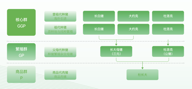 杂交过程中不同代际定义为一元猪、二元猪、三元猪。其中“祖代一元猪生产二元母猪,主要是长白猪和大白猪。“父母代”二元猪用来生产三元商品猪,母二元猪是一元猪的后代,公猪使用杜洛克作为终端父本。“商品代”三元猪是二元猪杂交出来的品种。