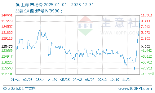 据生意社价格监测,2025年镍市全年低位磨底,临近年末因印尼镍矿商协会(APNI)声称,政府计划在2026年将镍矿生产配额大幅削减约34%,这一消息,让镍价大幅攀升至137733.33元/吨,全年上涨9.77%。全年最低价在12月16日的115050元/吨,最高价在年末的137733.33元/吨。