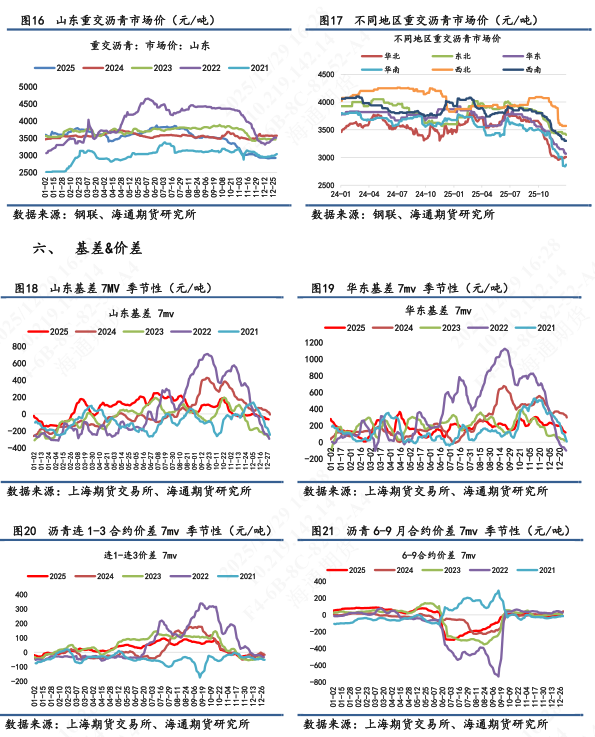 【2】现货市场:①山东重交沥青市场价为2920元/吨,环比持平,7天累计+0%。山东基差为-88元/吨,7天累计-46元/吨。②华东重交沥青市场价为3070元/吨,环比持平。华东基差为+62元/吨,7天累计-136元/吨。