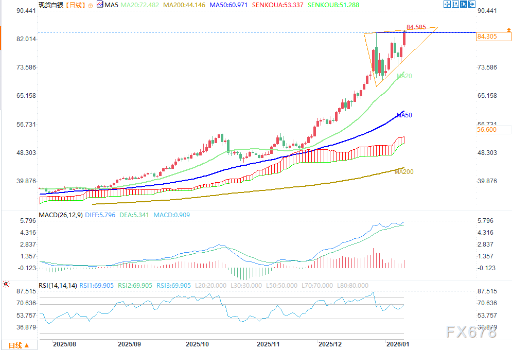 白银的技术面与黄金相似,正在上升三角形内盘整,略高于12月高点83.97美元。若价格突破并收于该水平上方,可能引发新一轮买盘,可在突破位上方建立多头头寸,并在下方设置止损。