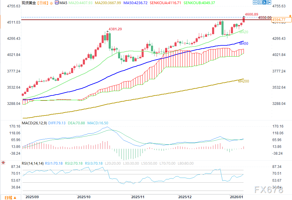 从黄金的技术面来看,在鲍威尔的最新消息推动下,金价突破了12月下旬创下的前历史高点4550美元。金价处于多条上升趋势中,50日和200日移动平均线均向上,此次突破提供了又一个建立多头头寸的平台,止损可设于4550美元下方以防范反转风险。金价在盘中一度触及4600美元,随后小幅回落,该水平成为初步的上涨目标。若继续突破,可根据价格走势决定何时减仓、持有或加仓,尤其是在关键整数关口附近,需参考近期价格行为。