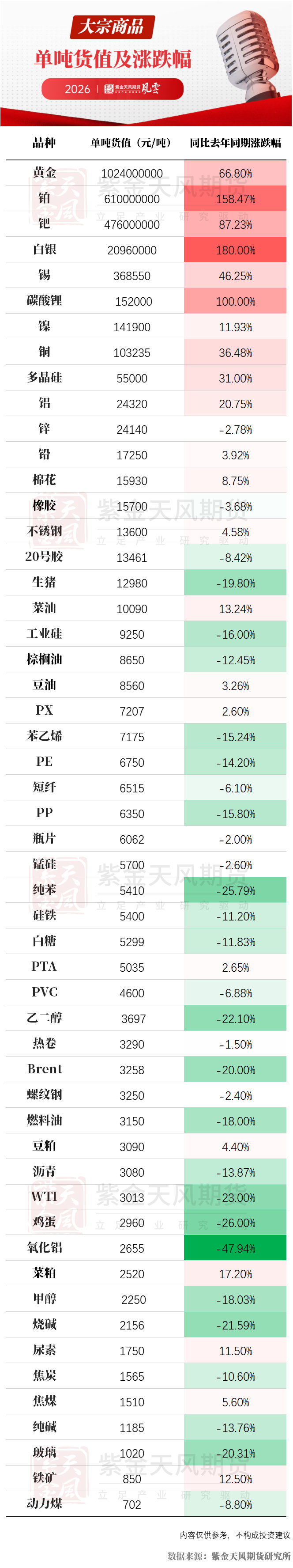 下面是相关品种的单吨货值及年度涨跌情况,供投资者参考。