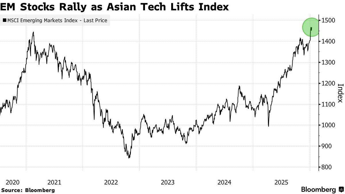 股市同步上扬,MSCI新兴市场股票指数上涨0.9%,逼近历史高点。阿里巴巴(BABA.US)、腾讯控股与台积电(TSM.US)涨幅居前,追随上周五华尔街的强劲收盘。港股走高,韩国股市在芯片及工业股带领下刷新纪录。