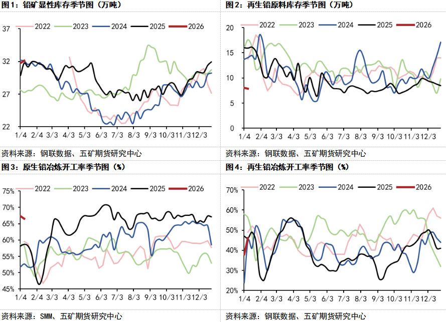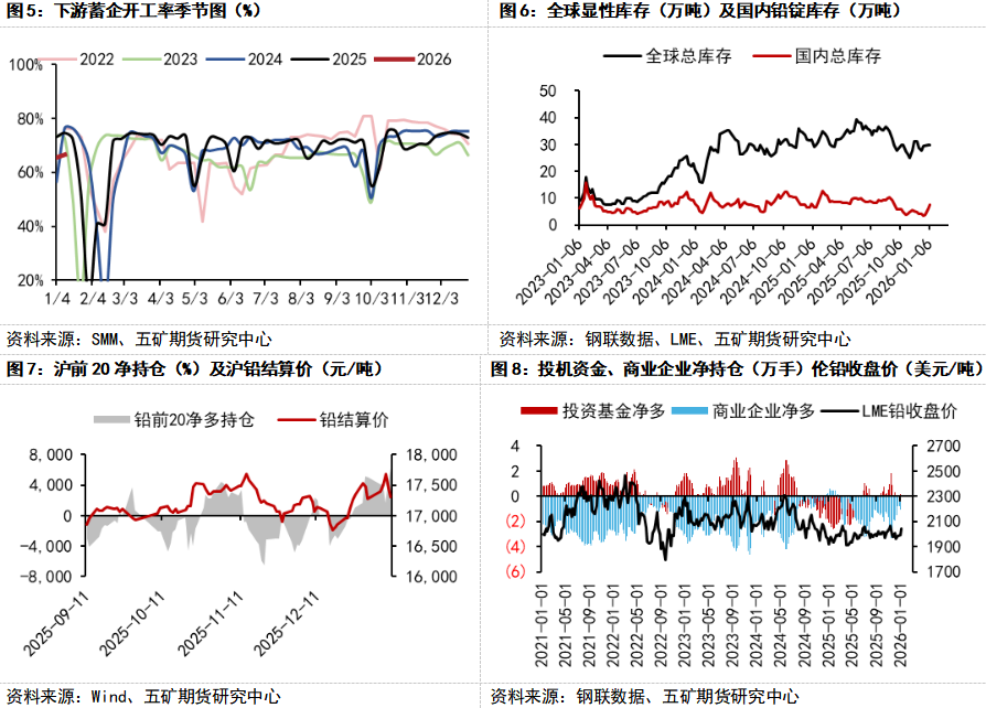 再生端,再生铅原料库存进一步下滑,未出现季节性冬季累库,原料水平显著低于往年同期。再生冶炼开工率显著抬升。冶炼厂成品库存大幅抬升。下游蓄企开工率下滑。原料废电瓶跟涨铅价幅度相对有限,过去2个月中再生铅冶炼利润较2025年2、3季度有一定改善,再生铅冶开工率边际上调。