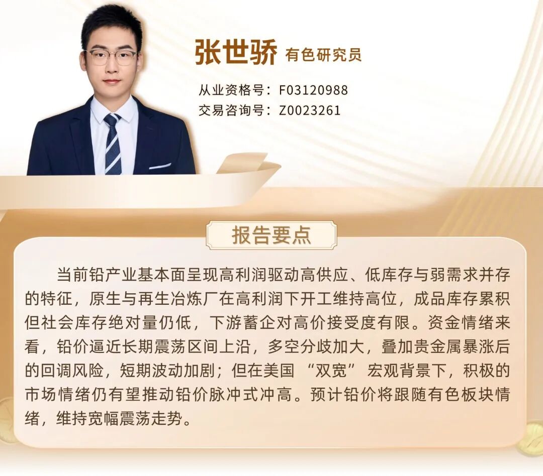 不过,在美国双宽的宏观周期下,市场整体情绪仍偏积极。预计在宏观流动性的支撑下,多头资金有可能推动铅价出现短期脉冲式上涨行情,短期脱离基本面约束。综上,预计铅价将维持跟随有色板块情绪的宽幅震荡格局。