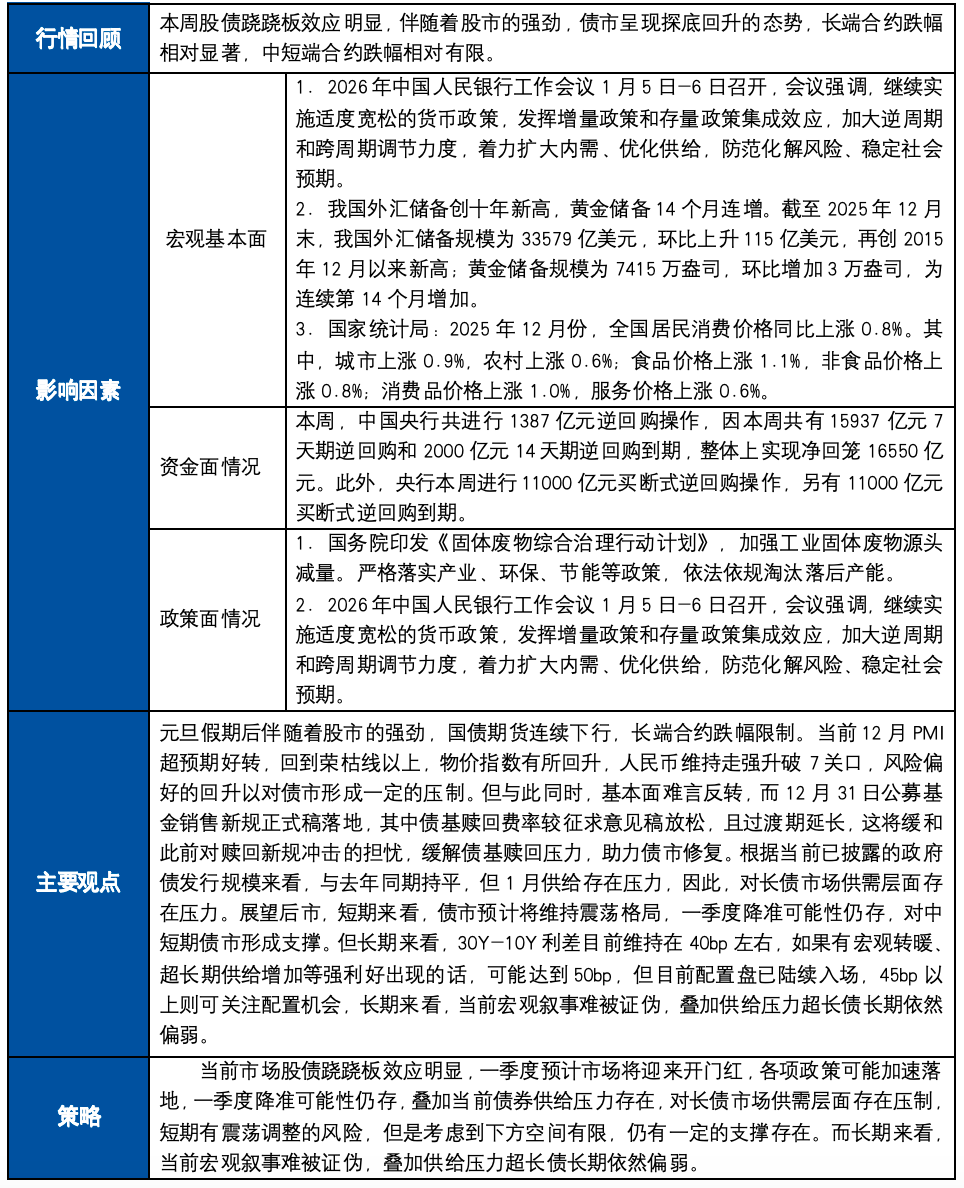 策略:当前市场股债跷跷板效应明显,一季度预计市场将迎来开门红,各项政策可能加速落地,一季度降准可能性仍存,叠加当前债券供给压力存在,对长债市场供需层面存在压制,短期有震荡调整的风险,但是考虑到下方空间有限,仍有一定的支撑存在。而长期来看,当前宏观叙事难被证伪,叠加供给压力超长债长期依然偏弱。