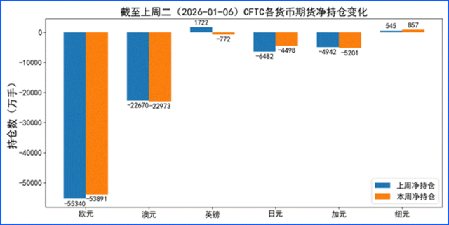 据美国商品期货委员会公布的2026-01-06期货市场头寸持仓报告显示,上周各货币的报告总持仓情况如下:欧元净多头变化1449手,澳元净空头变化303手,英镑净空头变化2494手,日元净多头变化1984手,加元净空头变化259手,纽元净多头变化312手,上周总持仓多空转换的货币有:英镑。除此之外,单向总持仓变动超过20%的货币有:纽元。