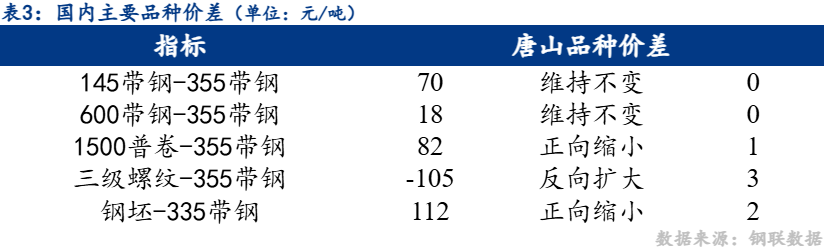 今日唐山市场1500普卷与带钢价差正向缩小1元/吨,暂无替代条件;螺纹钢与带钢价差继续反向扩大3元/吨,热轧带钢品种依旧强于螺纹。目前145系规格带钢因调坯厂成本较高依旧是最强规格。