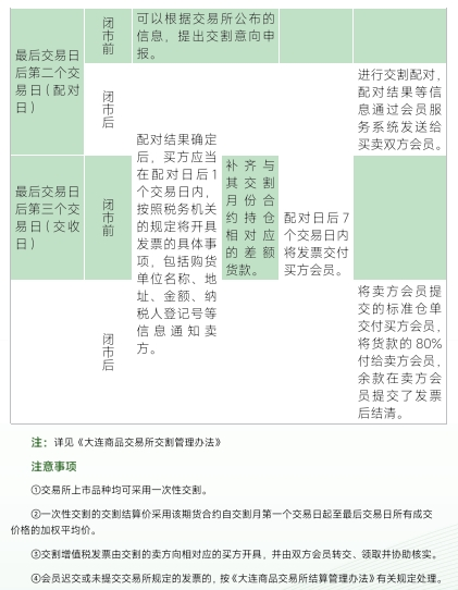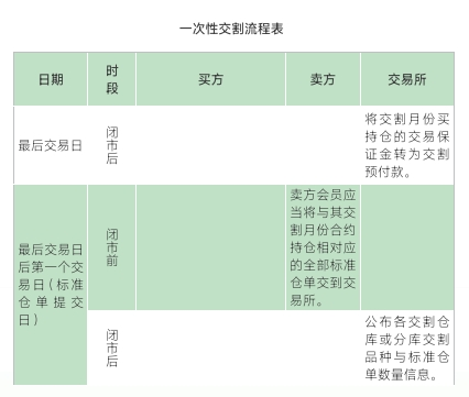 一次性交割是指在合约最后交易日后,交易所组织所有未平仓合约持有者进行交割的交割方式。一次性交割在了个交易日内完成,分别为标准仓单提交日、配对日和交收日(最后交割日)。在合约最后交易日后,所有未平仓合约的持有者须以交割履约,同一客户号买卖持仓相对应部分的持仓视为自动平仓,不予办理交割,平仓价按一次性交割的交割结算价计算。