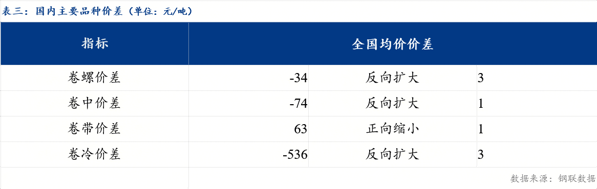 从品种价差来看,卷螺差较上一交易日反向扩大3元/吨,热中价差较上一交易日反向扩大1元/吨,热带价差较上一交易日正向缩小1元/吨,热冷价差较上一交易日反向扩大3元/吨。