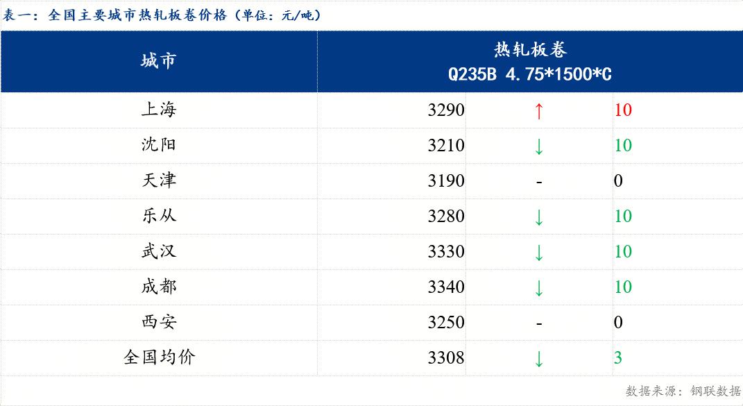 13日热轧板卷全国主要城市价格整体趋弱运行,截止发稿时4.75热轧板卷全国均价3308元/吨,较上一交易日下跌3元/吨。今日黑色系期货走势先扬后抑,热卷 01 合约收跌 0.09%,午后市场交投氛围明显转弱。
