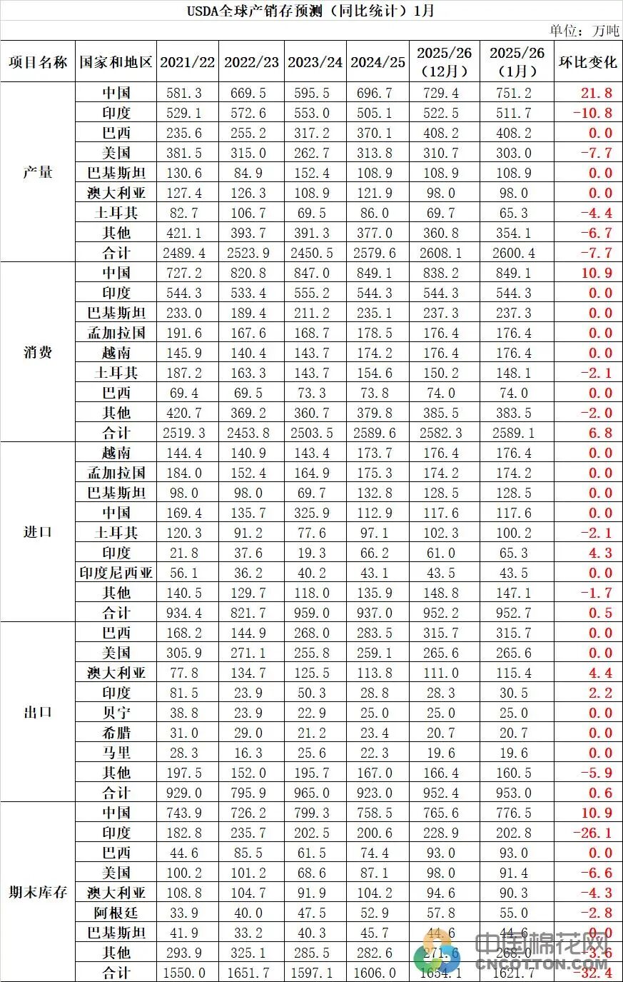USDA1月份月报:美国棉花产量下调全球期末库存下降