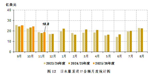 2025年11月,日本服装进口18.8亿美元,同比增长0.9亿美元,同比增幅5%。2025年9-11月,日本服装进口68.35亿美元,同比增长2.7亿美元,同比增幅4.1%(图12)。