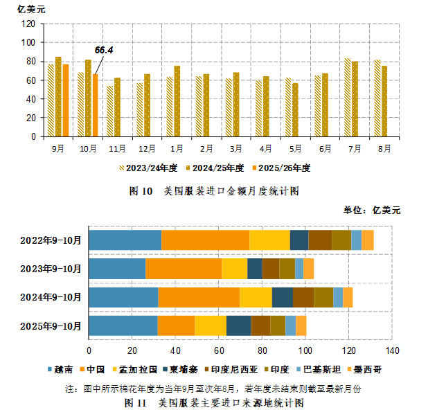 2025年10月,美国服装进口66.4亿美元,同比减少15.6亿美元,同比减幅19%。2025年9-10月,美国服装进口143.13亿美元,同比减少23.5亿美元,同比减幅14.1%(图10)。