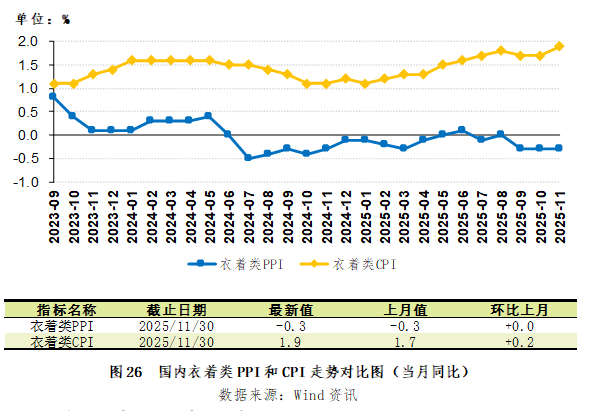 2025年11月,国家统计局公布的衣着类生产者价格指数(PPI)同比-0.3%,跌幅较上月持平,同期衣着类消费者价格指数(CPI)同比+1.9%,涨幅较上月扩大0.2个百分点(图26)。