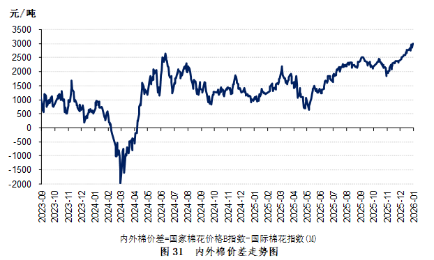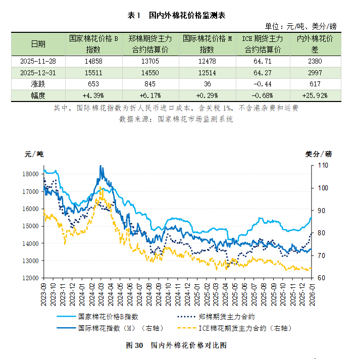 截至12月31日,国家棉花价格B指数15511元/吨,较上月上涨653元/吨;郑棉期货主力合约14550元/吨,较上月上涨845元/吨;国际棉花M指数(折1%关税人民币进口成本)12514元/吨,较上月上涨36元/吨;ICE棉花期货主力合约结算价64.27美分/磅,较上月下跌0.44美分/磅;内外棉价差为2997元/吨,环比扩大617元/吨(表1、图30、图31)。