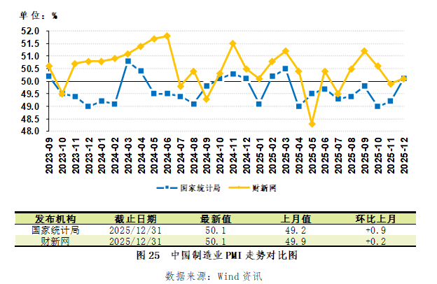 2025年12月,国家统计局公布的PMI指数为50.1,环比上升0.9个百分点,由财新网发布的代表中小企业的财新中国PMI指数为50.1,环比上升0.2个百分点(图25)。