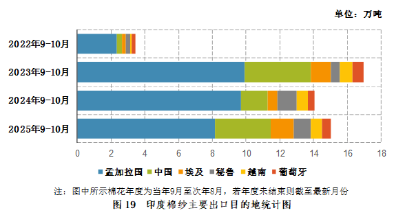 2025年9-10月,印度棉纱出口主要目的地为:孟加拉国(8.1万吨,占43%),中国(3.3万吨,占17.6%),埃及(1.3万吨,占7.1%),秘鲁(1万吨,占5.3%),越南(0.7万吨,占3.5%),葡萄牙(0.5万吨,占2.8%)(图19)。