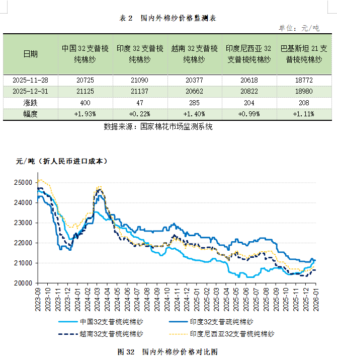 截至12月31日,中国32支普梳纯棉纱21125元/吨,较上月上涨400元/吨;印度32支普梳纯棉纱21137元/吨,较上月上涨47元/吨;越南32支普梳纯棉纱20662元/吨,较上月上涨285元/吨;印度尼西亚32支普梳纯棉纱20822元/吨,较上月上涨204元/吨;巴基斯坦21支普梳纯棉纱18980元/吨,较上月上涨208元/吨(表2、图32)。