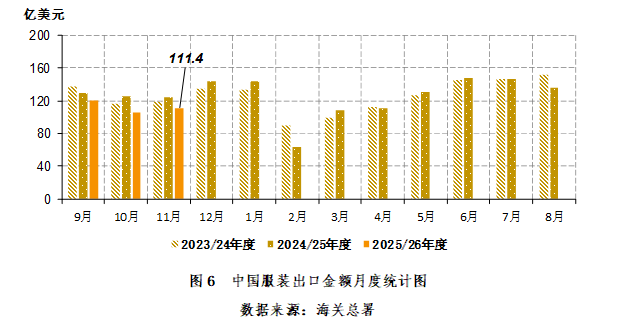 2025年11月,我国服装出口111.4亿美元,同比减少13.2亿美元,同比减幅10.6%。2025年9-11月,我国服装出口337.03亿美元,同比减少43.1亿美元,同比减幅11.3%(图6)。