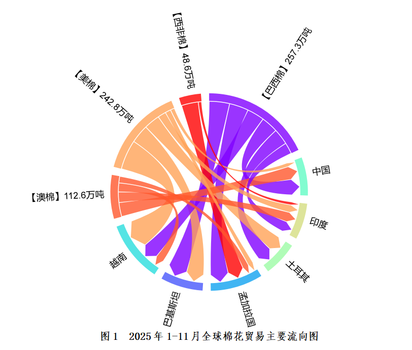 全球棉花出口主要来源于四大产区(图1),2025年1-11月,美棉出口主要流向越南(26.6%)、巴基斯坦(16.6%)、土耳其(14.2%)和印度(7.3%),出口中国占比仅为3.8%;巴西棉出口前五大目的地数量总体均衡,平均占比约为15%;澳棉出口贸易中,中国和印度是最主要买家,占比为27.2%和20.2%;西非棉主要流向孟加拉国(74.2%)和印度(15.1%)。