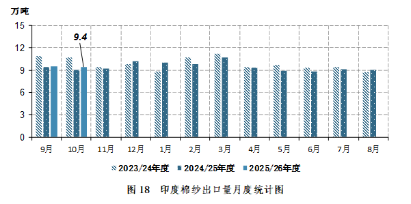 2025年10月,印度棉纱出口9.44万吨,同比增长0.4万吨,同比增幅4.7%。2025年9-10月,印度棉纱出口18.92万吨,同比增长0.4万吨,同比增幅2.4%(图18)。