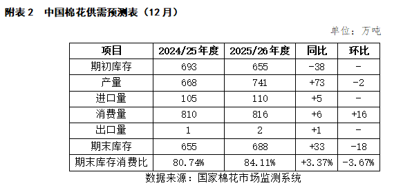 国家棉花市场监测系统2025年12月发布的供需数据显示,2025/26年度全国棉花产量741万吨,同比增加73万吨;消费量816万吨,同比增加6万吨;期末库存688万吨,同比增加33万吨(详见附表2)。