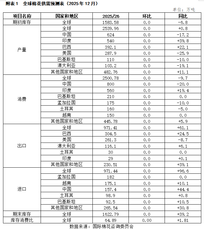 国际棉花咨询委员会(ICAC)2025年12月份发布的数据显示,2025/26年度,全球棉花期初库存1583.6万吨,环比持平,同比减少6.8万吨;产量2540.0万吨,环比持平,同比增加0.8万吨;消费2500.8万吨,环比持平,同比减少9.7万吨;期末库存1622.8万吨,环比持平,同比增加39.2万吨;期末库存消费比64.89%,环比持平,同比上升1.81个百分点(详见附表1)。