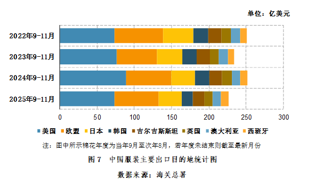 2025年9-11月,我国服装出口主要目的地为:美国(73.5亿美元,占21.8%),欧盟(58.8亿美元,占17.5%),日本(31.1亿美元,占9.2%),韩国(15.1亿美元,占4.5%),吉尔吉斯斯坦(15.1亿美元,占4.5%),英国(11.6亿美元,占3.4%),澳大利亚(10.9亿美元,占3.2%),西班牙(10.8亿美元,占3.2%)(图7)。