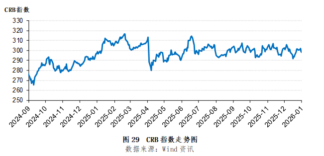 2025年12月,全球大宗商品价格先下跌后反弹,全月跌幅较小。截至12月31日,代表全球大宗商品价格走势的CRB指数收盘价为298.78,环比下跌0.90%(图29)。