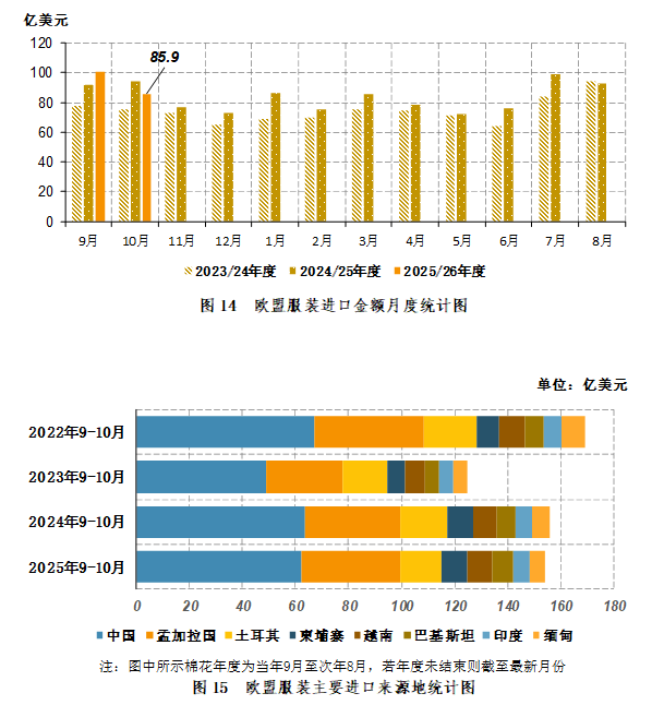 2025年10月,欧盟服装进口85.9亿美元,同比减少8.2亿美元,同比减幅8.7%。2025年9-10月,欧盟服装进口186.62亿美元,同比增长0.3亿美元,同比增幅0.2%(图14)。