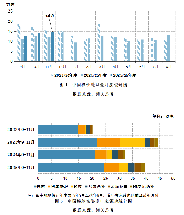 2025年11月,我国棉纱进口14.8万吨,同比增长2.5万吨,同比增幅20.3%。2025年9-11月,我国棉纱进口41.67万吨,同比增长5.8万吨,同比增幅16.3%(图4)。