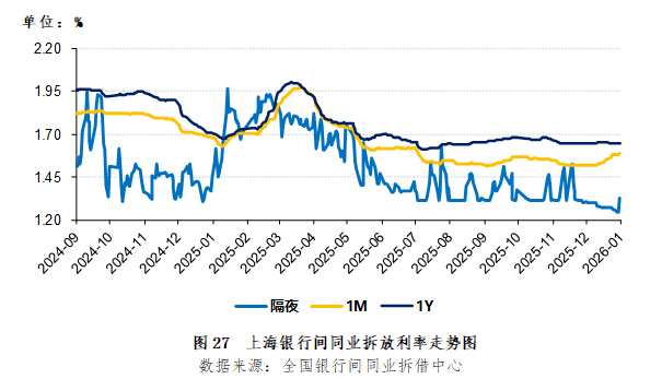 2025年12月,上海银行间市场各期限拆放利率走势分化,隔夜和中短期利率环比稳中有升,长期利率环比持平。12月31日,上海银行间同业3个月拆放利率1.6%,环比上升2.0个基点(图27)。
