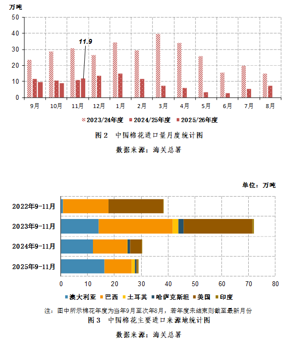 2025年11月,我国棉花进口11.87万吨,同比增长1.1万吨,同比增幅9.7%。2025年9-11月,我国棉花进口30.28万吨,同比减少2.8万吨,同比减幅8.6%(图2)。
