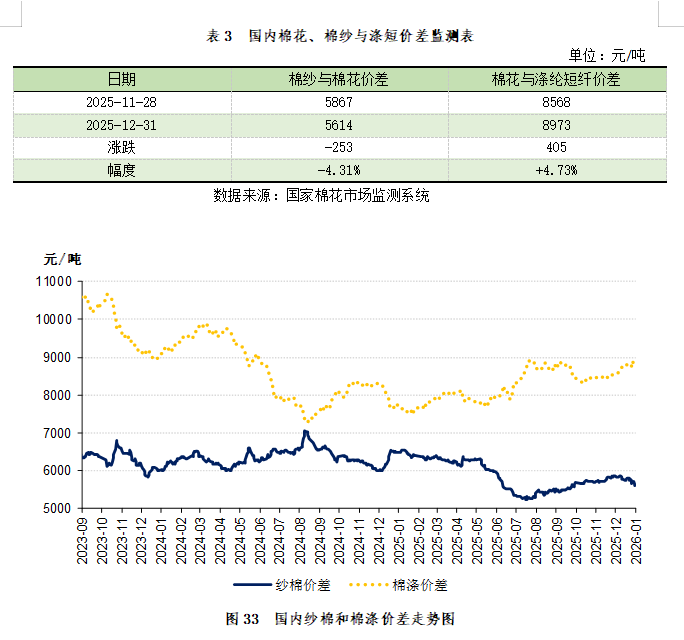 截至12月31日,国内纱棉价差5614元/吨,环比缩小253元/吨;棉涤价差8973元/吨,环比扩大405元/吨(表3、图33)。