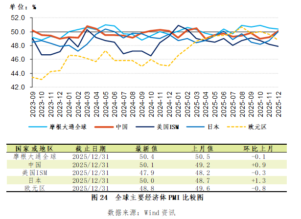 2025年12月,全球制造业采购经理人指数(PMI)环比略有下降,主要经济体PMI指数走势分化,其中,中国和日本PMI指数环比上升,并重新回到扩张区间,美国和欧元区PMI指数环比下降(图24)。