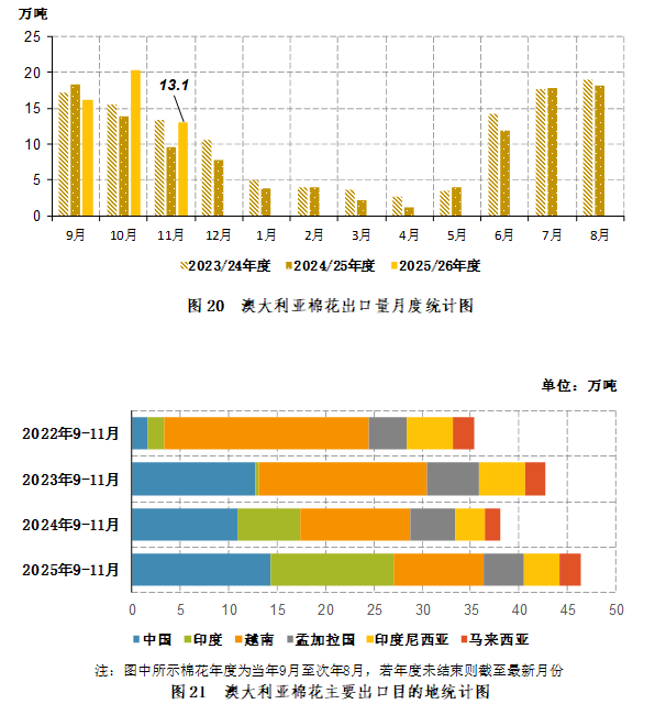 2025年11月,澳大利亚棉花出口13.11万吨,同比增长3.5万吨,同比增幅35.9%。2025年9-11月,澳大利亚棉花出口49.49万吨,同比增长7.7万吨,同比增幅18.3%(图20)。